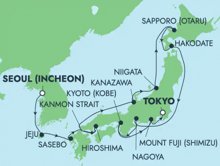 現代的に一新されたノルウェージャン・スピリットでアジアの魅力を満喫する旅へ。 韓国では世界最長の溶岩洞である済州の萬丈窟(マンジャングル)を探検。 スキージャンプの頂上、大倉山の展望台までスキーリフトで登り、素晴らしい札幌の眺めをご覧ください。 そして、海鮮が国内でも特に美味しいこの地域を訪れるからには、ぜひ新鮮な海の幸をご賞味ください。