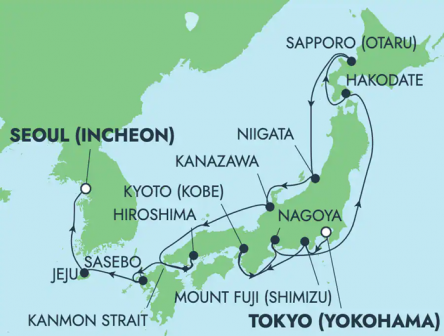 ノルウェージャン・スピリットで日本から韓国までを満喫するバケーションクルーズに出発。 受賞歴を誇る神戸牛を味わい、酒造所や酒ミュージアムめぐりで日本酒を堪能し、3世紀に建立された生田神社も訪れます。 小樽では、数千もの個性的なオルゴールを集めた小樽オルゴール堂を訪れたり、活気ある札幌の街をガイド付きツアーで観光することができます。 広島では、平和記念資料館や原爆ドームを訪れて、過去の惨禍について学びましょう。その後は、ショップやグルメなレストランが並ぶ大通りを散策できます。 ソウルでは1泊し、五大宮や賑わう市場、美術館や博物館、素晴らしい現代建築、美味しい料理など、首都の魅力を時間をかけてお楽しみいただけます。