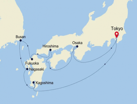 温泉からネオン輝く街、この世のものとは思えないほどの料理、そして素晴らしい自然の景色まで、日本が提供するすべてを体験してください。東京で挟まれたこの旅は、豊かな文化遺産の大阪から始まります。広島は人間の回復力に敬意を表し、福岡では博多ラーメンをぜひ味わってください。韓国に飛び、象徴的な釜山を体験してください。長崎と鹿児島で夢の休暇を過ごし、海でリラックスした日々を過ごしてください。
