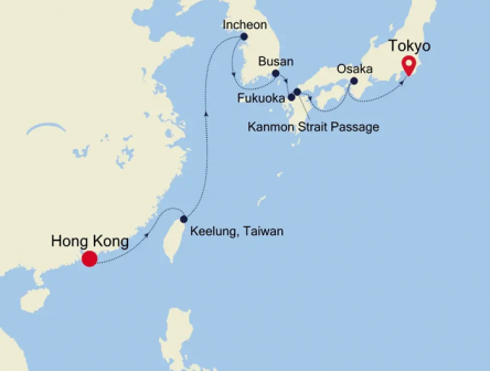 日本、中国、台湾、韓国を巡るこの旅では、エキゾチックな場所と融合した非常に異なる文化を体験できます。香港から出航し、夢のような基隆海岸へ向かいます。エメラルド色の山々が、水辺の虹色に輝く家々を見守っています。伝統と現代が融合するソウルで一泊し、釜山の自然の素晴らしさに驚嘆してください。世界的に有名な福岡の料理を堪能した後、大阪で一泊し、東京へ向かいます。