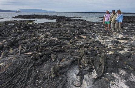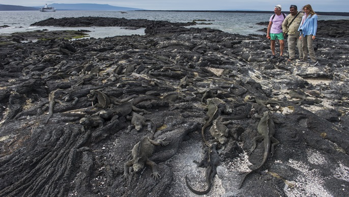 フェルナンディナ島_ガラパゴスクルーズ午前、諸島内の最西端にあるフェルナンディナ島のプンタ・エスピノーサに上陸。たくさんの大型ウミイグアナが群生する光景を見学したり、ペンギンやコバネウを探して楽しみます。