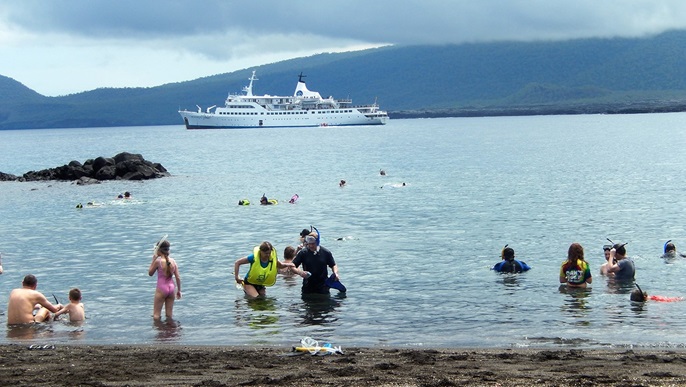 午後、赤道に最も近いイサベラ島のプンタ・ビセンテ・ロカを洋上からボートで見学したり、スノーケリングを楽しみます。その後、船は諸島の中央へと戻ります。