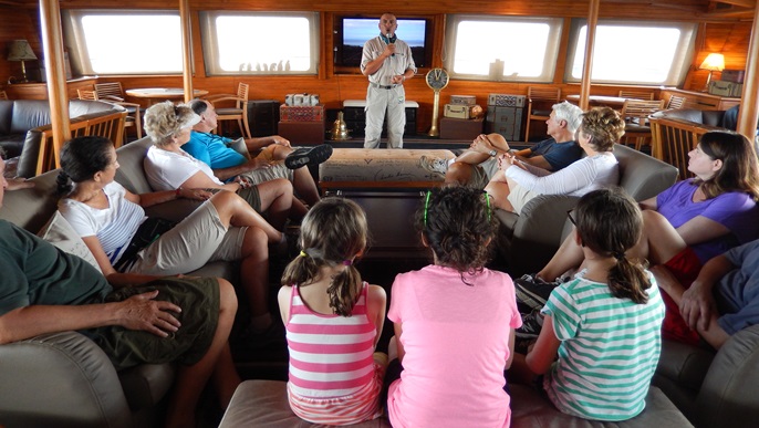 夕食前、ウエルカムドリンクを楽しみながらクルーとガイドの紹介セレモニー。明日のスケジュール説明会終了後、夕食。- 宿泊