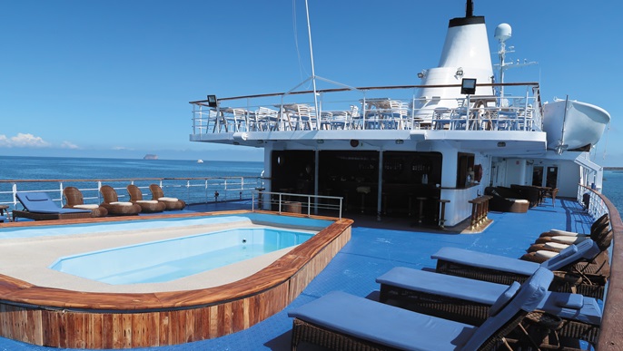 船内には、パノラマラウンジ、オープンバー、屋外プール、ジャクジーやジムの設備があります。赤道直下のガラパゴス諸島クルーズを優雅にのんびりとお楽しみください。また、ガラパゴス諸島の知識が豊富なナチュラリスト・ガイドの案内で見学するエコツアーを存分にお楽しみください。