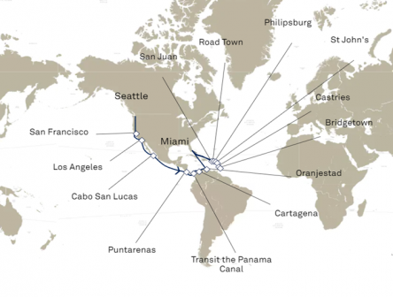 クイーン・エリザベスで33泊のホワイトスター・サービスをお楽しみいただけるこのクルーズは、パナマ運河を完全通過し、プンタレナス、カルタヘナ、オラニエスタッド、マイアミの魅惑的な港に寄港します。