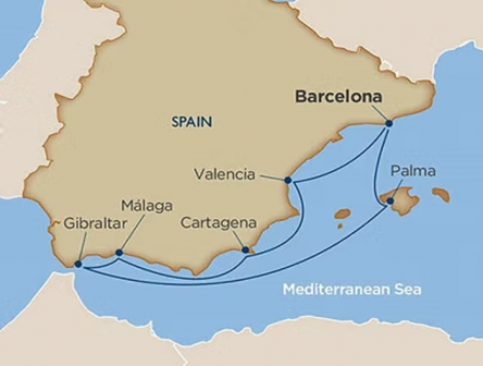マラガを出発し、ジブラルタルやカルタヘナなど、スペインとイギリス領の歴史ある港町を巡るクルーズ。美しいビーチと歴史的建造物が魅力のバレンシアやパルマ・デ・マヨルカを訪れ、最後はバルセロナで締めくくる、文化と景観の豊かな旅です。