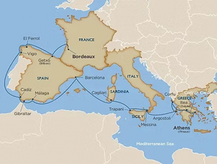 フランスのワインの都ボルドーから、スペイン、イタリア、ギリシャを巡る贅沢な旅。美食と歴史に彩られた港町やコリントス運河の絶景を楽しみながら、地中海の魅力を満喫する特別なクルーズです。