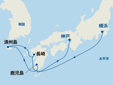 横浜発・神戸着、九州の鹿児島、長崎と韓国の済州島を寄港するコースです。