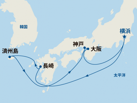 横浜発、長崎と韓国の済州島、関西の神戸、大阪を寄港するコースです。