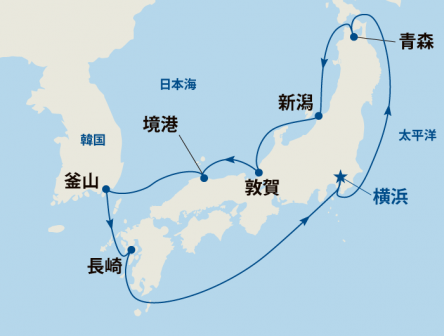 横浜発、青森、新潟、敦賀(福井)境港(鳥取)。韓国の釜山と九州の長崎を巡るコースです。