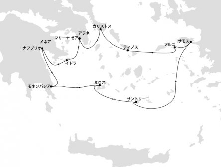 午後には出港し、サントリーニ島のぶどうから作られたワインを楽しみながら、キクラデス諸島から東エーゲ海の島々へとクルーズしていきます。