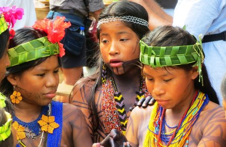 テンダーボートでプラヤ・ムエルトへ。エンベラ村ではパナマに住む7つの先住民の内の1つであるエンベラ族の歓迎を受けます。