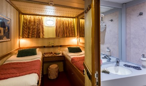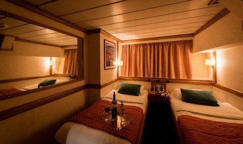 ローワーデッキに位置し、丸窓があります。客室には、エアコン、テレビ、電話、ヘアードライヤー、ミニ冷蔵庫、セントラルミュージック、船内放送受信システム、セーフティボックスが完備されています。設備の整ったバスルームは、人工大理石で仕上げられています。