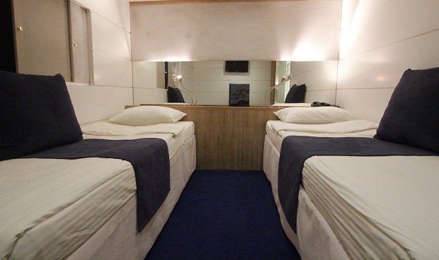 メインデッキに位置しています。客室には、シャワー付きバスルーム、個別の空調システムシステム、有線音楽、薄型テレビ(衛星チャンネル)、CD/DVDプレーヤー、内線電話、ミニ金庫、ミニ冷蔵庫、ヘアードライヤー、アダプター(220V)などが完備されています。