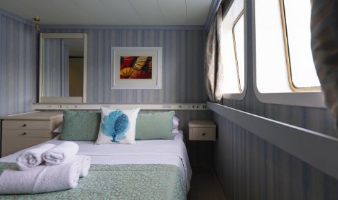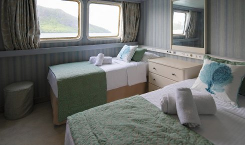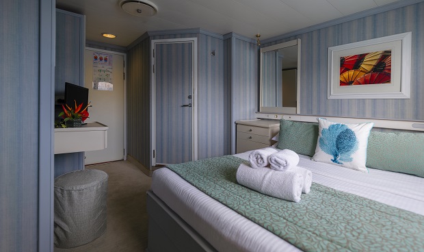 カテゴリーBは、ダブルベッドまたは、ツインベッド。メインデッキとサンデッキにある広々とした客室で、大きな窓からは寄港地のユニークな景色が楽しめます。客室には、シャワー付きバスルーム、個別の空調システム、有線音楽、薄型テレビ(衛星チャンネル)、内線電話、ミニ冷蔵庫、ミニ金庫、ヘアードライヤー、アダプター(220V)が完備されています。