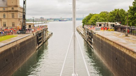 スーセントマリー運河観光ヴィクトリーⅠは、水位差約 6 メートルのスペリオル湖とヒューロン湖をつなぐ歴史的なスーロックスを通航しますので、早めに起床して見学します。この運河を貨物船、はしけ、タグボートなどが行き交っています。
