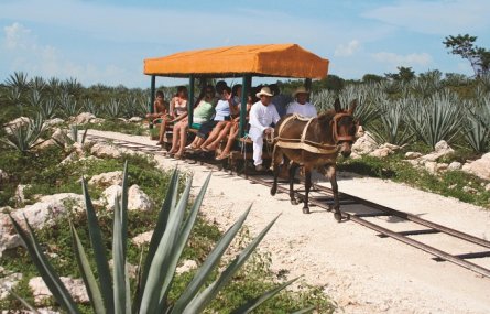 ヴィクトリー・クルーズ社のもう一つの特別手配は、ユカタン半島最後の大規模農場の訪問です。かつて裕福なペオン家が所有していた19世紀のアシエンダ(大規模農場)を訪れます。緑豊かな敷地に大きな柱廊のベランダがある荘園では、ラバが曲がりくねった線路にそって荷車を引いていた木製のプラットフォームを見学します。ラバが引く荷車は、アガベサボテンを栽培する広大な畑へ労働者を運ぶための伝統的な輸送手段でもありました。また、ヘネケンサボテンを繊維に加工するために使用していた昔の機械を見学します。ヘネケンは、繊維に加工してハンモックから船を埠頭につなぐ巨大な大綱に至るまで作られました。また、アガベは、テキーラの原料としても使われています。