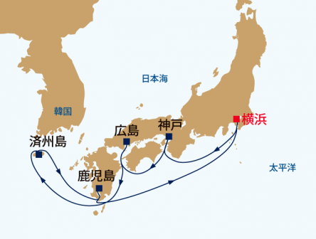 このコースは初夏の季節に人気寄港地の神戸、広島、鹿児島、韓国の済州島を訪れます。