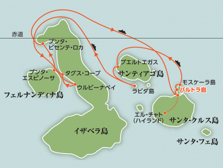 ガラパゴス・レジェンド号5日間Bクルーズは諸島内の西部を巡ります。乗船初日はバルトラ島空港の北隣にあるアシカの棲むモスケーラ島に上陸してから諸島内の最西端まで向かいます。