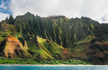 カウアイ島ⒸHawaii Tourism Authority午後、カウアイ島を代表する絶景スポット、ナ・パリ・コーストをクルージングします。カウアイ島の断崖絶壁に沿いながら、自然が創り出す思わず息をのんでしまうほど美しい景色を船上から優雅にお楽しみください。