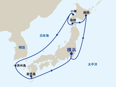 横浜発着、北海道から九州、韓国を巡るコースです。