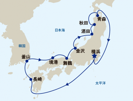 横浜発着、本州九州と韓国を巡るコースです。