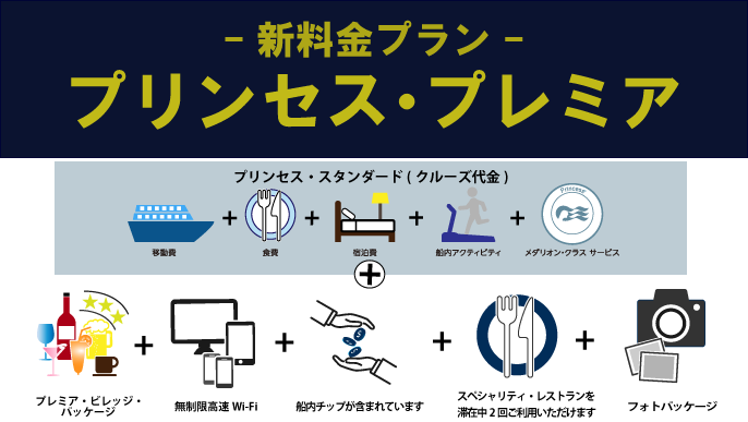 プリンセス・プラスに加え、有料レストラン無制限無料、アルコール/ソフトドリンク無制限無料、プロカメラマン撮影のフォトパッケージ付き