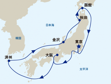 ●春の桜に彩られた日本全国を巡る東京発の10日間のクルーズでは大阪、済州島、金沢、秋田、函館を訪れた後に東京に帰港します。