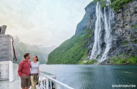 6~8月は蛇行しながら内陸へと深く入り組んだ、ガイランゲル・フィヨルドを航行します。波静かな海面の周囲には、緑の草木に彩られた500m級の山々がそびえ、そこから大小の滝が流れ落ちる絶景が見られます。