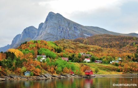 9~10月はガイランゲル・フィヨルドの南側にあるヨールン・フィヨルドを航行します。周囲にそびえる山々、沿岸に点在する牧歌的な村々など、多くの船や観光客が訪れる夏とは一味違う穏やかな雰囲気が魅力です。