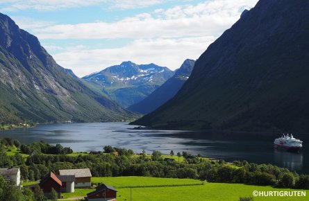 9~10月はガイランゲル・フィヨルドの南側にあるヨールン・フィヨルドを航行します。周囲にそびえる山々、沿岸に点在する牧歌的な村々など、多くの船や観光客が訪れる夏とは一味違う穏やかな雰囲気が魅力です。
