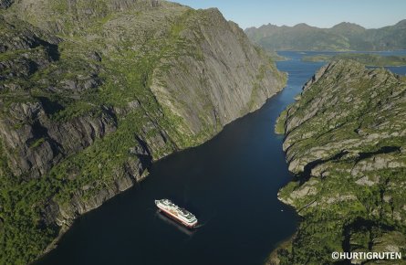 ヴェステローレン諸島とロフォーテン諸島の間の海峡。20kmにわたり両岸に1,000m級の山々が連なります。北行きコースでの航行は夜ですが、南行きコースは日中に通過するので「海のアルプス」と形容される絶景を楽しめます。