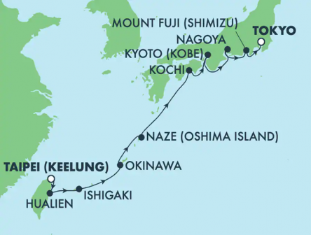台湾、日本をめぐる旅へ、ノルウェージャン・スカイがご案内します。 日本の滞在は、豊かな緑、美しいビーチ、サンゴ礁に囲まれた静かな島、石垣島からスタート。 続いて、活気に満ちた名古屋は繁華街や美術館、お城など見どころが充実しています。 海辺の町から大都市まで日本の9か所を探訪し、魅力をじっくり体験できます。