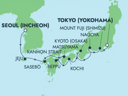 新しく生まれ変わったノルウェージャン・スピリットで、日本の魅力を満喫する旅へ。 出発地の韓国では、世界最長の溶岩洞である済州の萬丈窟(マンジャングル)を探検。 日本第三の都市、大阪では、威風堂々とした大阪城や日本最古の仏教寺院である四天王寺を訪れることができます。 名古屋ではノリタケの森を散策し、プラネタリウムで星を眺めましょう。 東京の玄関口である横浜では、ネオンサインに彩られた高層ビル街を歩いたり、ミシュランの星付きレストランで伝統的な和食を味わったりしてお過ごしください。
