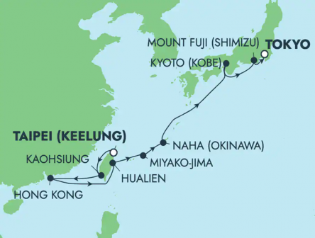 ノルウェージャン・スピリットで日本、中国、台湾を巡る旅へ。 アジアの食の都とも呼ばれる香港では、近代的な高層ビルと古くからの伝統、そして素晴らしい食が融合した旅をお楽しみください。 那覇では、郊外の美しい風景を楽しみ、戦跡を訪れ、沖縄の文化に触れましょう。世界で最も人口の多い都市、東京は想像力を刺激する街。この驚くほどの大都会では、きっと何か楽しいことが見つかります。