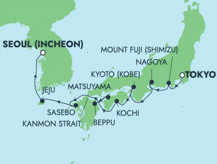 アジアでの思い出深いバケーションに、ノルウェージャン・スピリットがお連れします。日本で最も美しい港の一つである清水から、神々しい富士山の素晴らしい眺めを堪能しましょう。 高知では、高知城を見学したら、高知ならではの味覚、有名なカツオのたたきをぜひお召し上がりください。続いては有名な温泉地別府天然の湯や泥湯、砂湯の癒しをご体験ください。仁川からはソウルを訪れ、現代的な都市と古くからの伝統が共存する5000年の歴史をご体験ください。