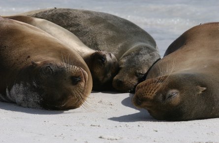 くつろぐアシカ/ガラパゴスクルーズ朝: サンタ・クルス島の北海岸にある白砂の美しいビーチ、ラス・バーチャスに上陸。水鳥が羽を休めるラグーンを見学。