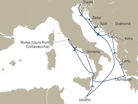 クイーン・ヴィクトリアで巡る地中海のアドベンチャーは、ローマに始まり、ローマに終わります。モンテネグロ、マルタ、クロアチアなど、歴史的な名所を訪れて、美味しい地元料理をご堪能ください。