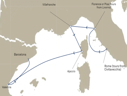 コルシカ島の楽園、アジャクシオでハーブ・ド・マキの香りを味わいながら、トスカーナワインやスペイン名物のスモーキーなタパスを味わい尽くす7泊の地中海クルーズです。