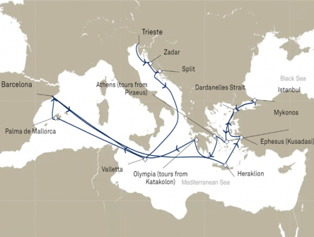 トリエステ発のこのクルーズで、思いがけない発見があるかもしれません。賑やかなミコノス島でのバー巡りや、スプリトの古代遺跡巡りなど、地中海の見どころ満載のこの壮大なクルーズは、あらゆる旅行者にご満足いただけます。