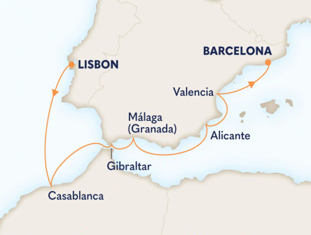 バルセロナへのクルーズでは、カサブランカの活気ある市場を散策し、ジブラルタル海峡の美しい景観を楽しむひとときを過ごします。マラガとマヨルカでは、絶品タパスを堪能しながら、スペインの食文化を満喫できる贅沢な旅が待っています。