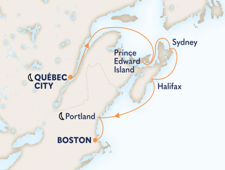 魅力あふれるケベックシティを後にし、セントローレンス川をクルーズしながらシャーロットタウンの美しい海岸へと向かいます。ボストンに到着する前に、シドニーのフィドルの音色やハリファックスの歴史的な名所を存分に楽しみましょう。