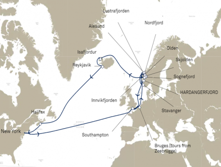 アイスランドのラグーンとノルウェーフィヨルドを巡る31泊のクルーズ。オーレスンとレイキャビクに上陸。また、クイーン・メリー 2がイーサフィヨルズルに初寄港する歴史的なクルーズです。