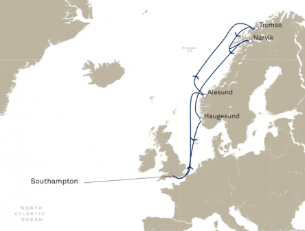 トロムソとナルヴィクへの夜遅くの寄港は、このノールカップクルーズのハイライトです。運が良ければ、この地域ではよく見られるオーロラの光景を目にすることができるでしょう。