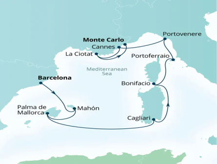 シーボーンクルーズで、魅惑の地中海の旅へ出発しましょう。バルセロナからスタートし、メノルカ島やマヨルカ島の美しいビーチを満喫。続いてサルデーニャやコルシカ、エルバ島の歴史的な港町を探索し、最後はフランスのカンヌやラ・シオタで優雅なひとときを楽しめます。多彩な文化と美しい景色が織りなすこのクルーズは、忘れられない思い出を提供します。