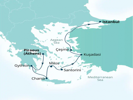 シーボーンクルーズでは、ギリシャとトルコの美しい島々を巡ります。アテネのピレウスを出発し、スパルタの歴史を感じるギシオン、クレタ島のハニア、魅惑のミロス島やサントリーニ島、賑やかなミコノス島を訪問。エフェソスやチェシュメを経て、最終的にはイスタンブールに到着します。美しい風景と豊かな文化に満ちたこの旅をお楽しみください。