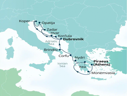 シーボーンクルーズで、ギリシャの美しい島々とクロアチアの魅力を満喫しましょう。アテネを出発し、中世のモネンバシア、歴史あるデルフィ、自然美あふれるニドリを訪れます。コルフやブリンディジでの文化体験を楽しんだ後、ドゥブロヴニクやコルチュラ島の絶景に感動。リラックスした海の日々を経て、スロベニアのコペルやフヴァルで新たな発見が待っています。あなたの旅を特別なものにする航海が始まります。