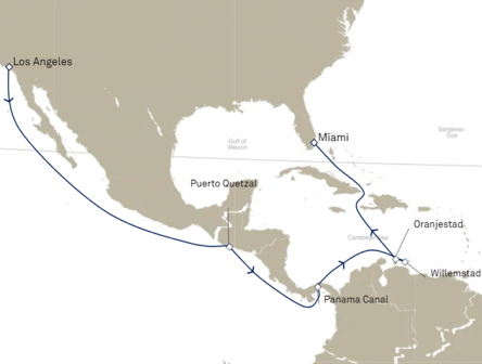 ロサンゼルスでクイーン・アンに乗船した後は南方面へ航海し、世界的に有名な人工建造物の驚異、パナマ運河を通過します。キュラソー島とアルバ島を心ゆくまで探索した後は、マイアミに到着します。