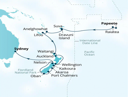 シーボーンクルーズで、魅惑の南太平洋を探索しましょう!フランス領ポリネシアのパペーテを出発し、美しいライアテア島や神秘的なミステリー島を訪れます。フィジーやニュージーランドの息を呑むような風景を楽しみ、オーストラリアのシドニーで旅を締めくくる贅沢な日々が待っています。海の上でのリラックスした時間と新しい文化との出会いを楽しんでください。あなたの冒険がここから始まります!
