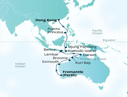 美しいオーストラリアやインドネシアの海を巡るシーボーンクルーズで、素晴らしい冒険が待っています。フリーマントルから出発し、エクスマスやブルーム、クリ湾を訪れ、神秘的なキンバリー海岸をクルーズ。さらに、ロンボク島やバリ島、コモド島、スラウェシ島といった魅惑的な目的地へも足を運びます。プエルト・プリンセサでの自然探検も楽しめる、夢のような旅をご堪能ください。